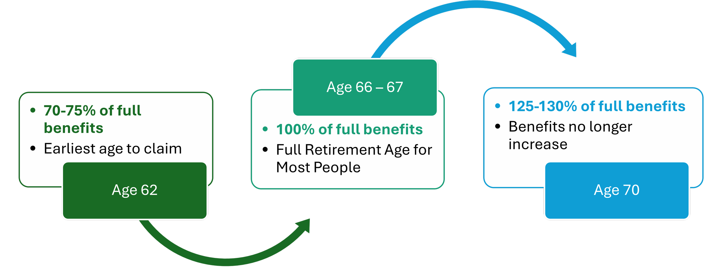 - Delaying past full retirement age increases benefits by roughly 8% per year until age 70.