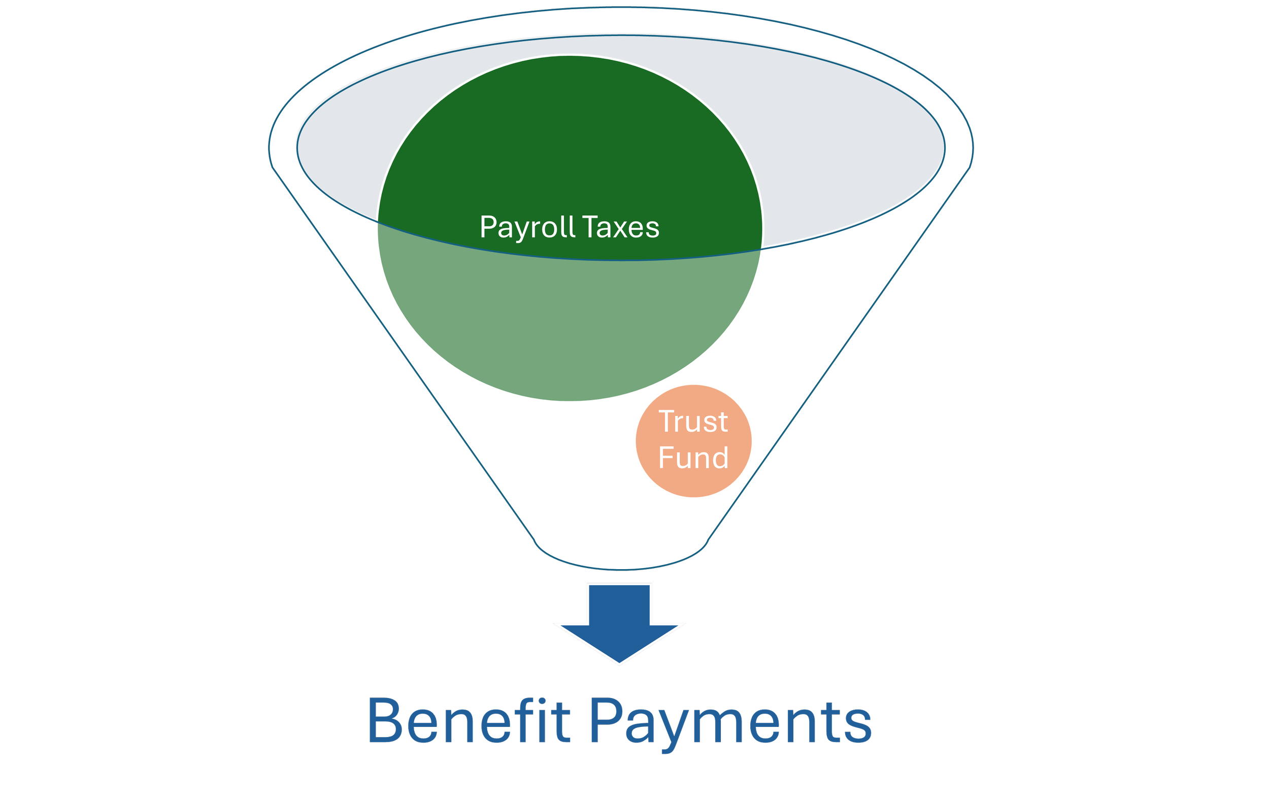 Social Security is primarily a pay-as-you-go system. Payroll taxes collected from current workers are used to pay benefits to current retirees. When tax receipts exceed the benefits being paid to retirees, the excess money goes into the trust fund. When tax receipts are less than benefit payments, the trust fund covers the difference.